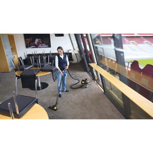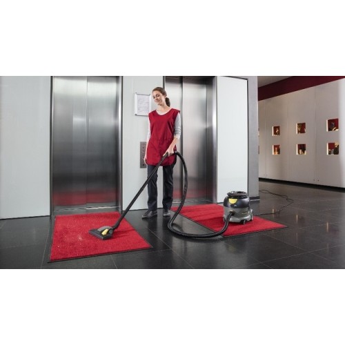 Пилосос Karcher T 12/1 eco!efficiency стандартно оснащений високоефективним мішковим тканинним фільтром, який може досягати об'єму в три рази більшого в порівнянні з паперовим фільтром. Дуже низький рівень шуму – лише 56 дБ(А). Продуктивність двигуна, потік повітря та 6-ступінчаста система фільтрів моделі T 12/1 eco!efficiency – мінімізація втрати в потужності всмоктування. Низький центр важкості. Кабель електроживлення може бути підвішений у спеціальному місці для зберігання або зачеплений за висувний гачок. Насадка для підлоги знаходиться в тримачі аксесуарів, який може бути використаний і для зберігання аксесуарів на машині в неробочий час. Всмоктуючий шланг має просту, але ефективну систему затискачів при підключенні. Ви натискаєте на шланг блоку всмоктування пристрою, а еластичний кільце зачіпляється. Ця система гарантує, що шланг не відірветься, коли пристрій потягне за собою. Нова система затискачів (заміна проводиться без використання спец. інструментів) дозволяє легко подовжити всмоктувальний шланг на 2,5 м. Зі щіткою ESB 28 (дод. аксес.) T 12/1 eco!efficiency перетворюється на пилосос щіткового типу. Також Ви можете використовувати HEPA-фільтр, який утримує наддрібні частинки (99.95%) замість стандартного повітряного фільтра.