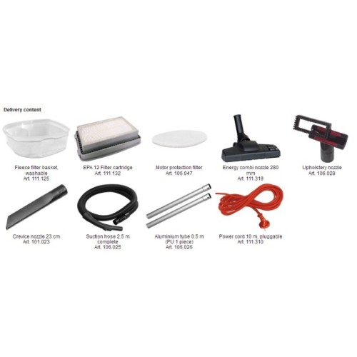 Комплектація: комбі-насадка 280 мм, щілинна насадка, насадка для оббивки та м'яких меблів, вакуумні трубки з алюмінію 2х0,5м, шланг всмоктувальний 2,5 м, флісовий фільтр-кошик, флісовий фільтр-мішок, фільтр HEPA H1