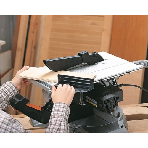 Переносна торцювальна пилка має високу потужність і велику глибину пропилу. Модель оснащена лазерним покажчиком лінії пропилу, встановленим на шайбі притискної пильного диска. Таке розташування збільшує точність за будь-якого положення пильного диска і знижує похибку від вібрації. Лінія, вказана лазером, відповідає крайньому положенню зуба пильного диска під час пропилювання. Головка пилки нахиляється на кут від 0 ° до 45 °. Поворотний стіл із кутом повороту від -45° до +45°, фіксацією кратних кутів та можливістю встановлення нестандартних кутів повороту столу. Відрізняється великою глибиною пропилу, що дозволяє використовувати цю модель для торцювання віконного профілю і т.д. Застосовується для обробки деревини та МДФ профілів. Оснащена верхнім столом з новою системою регулювання вильоту пильного диска поздовжньої напрямної. Система безпеки включає вбудоване гальмо диска, захист від випадкового запуску завдяки переривачу подачі струму та запобіжник, що захищає двигун від перепадів напруги в мережі, а також захисний кожух пильного диска, що забезпечує безпеку працівника. Має стопор пильного диска для полегшення його заміни та безшумний редуктор із ремінною передачею.