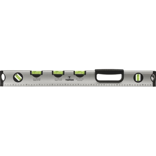 Рівень будівельний спеціальний TOPEX має 5 ампул, розташованих під кутами 0 °, 1.5 °, 3.5 °, 45 ° і 90 °.