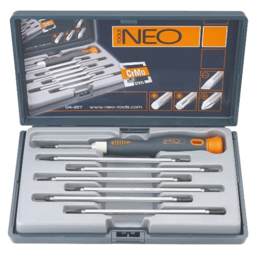 Набір прецизійних викруток NEO у наборі рукоятка та 7 двосторонніх насадок 120 мм (шліцевих, хрестових, Torx та шестигранних).