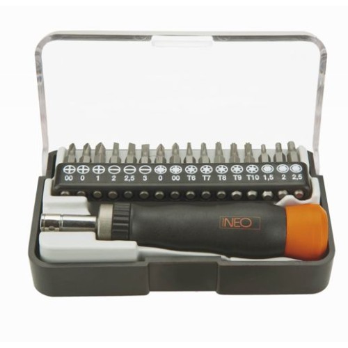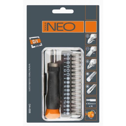Набір прецизійних викруток NEO у наборі рукоятка та 16 наконечників 30 мм (шліцевих, хрестових, Torx та шестигранних).