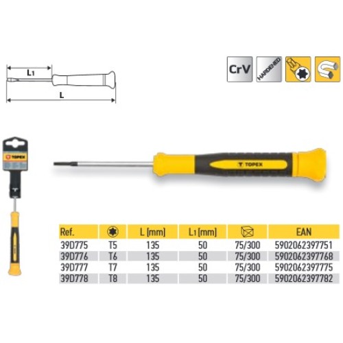Викрутка прецизійна Torx Topex призначена для виконання механічних робіт, а також робіт, які виконують майстри-аматори.