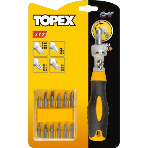 Змінні наконечники, набір 13 шт., двокомпонентна рукоятка з тріскачкою з блокуванням ліво, право, з поворотною головкою на 90 градусів, наконечники: шліцеві 4, 5, 6, мм, PH1, PH2, PH3, PZ1, PZ2, PZ3, H4,