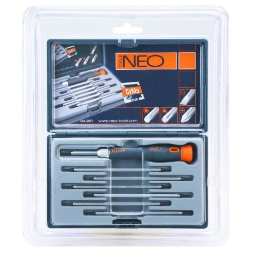 Набір прецизійних викруток NEO у наборі рукоятка та 7 двосторонніх насадок 120 мм (шліцевих, хрестових, Torx та шестигранних).